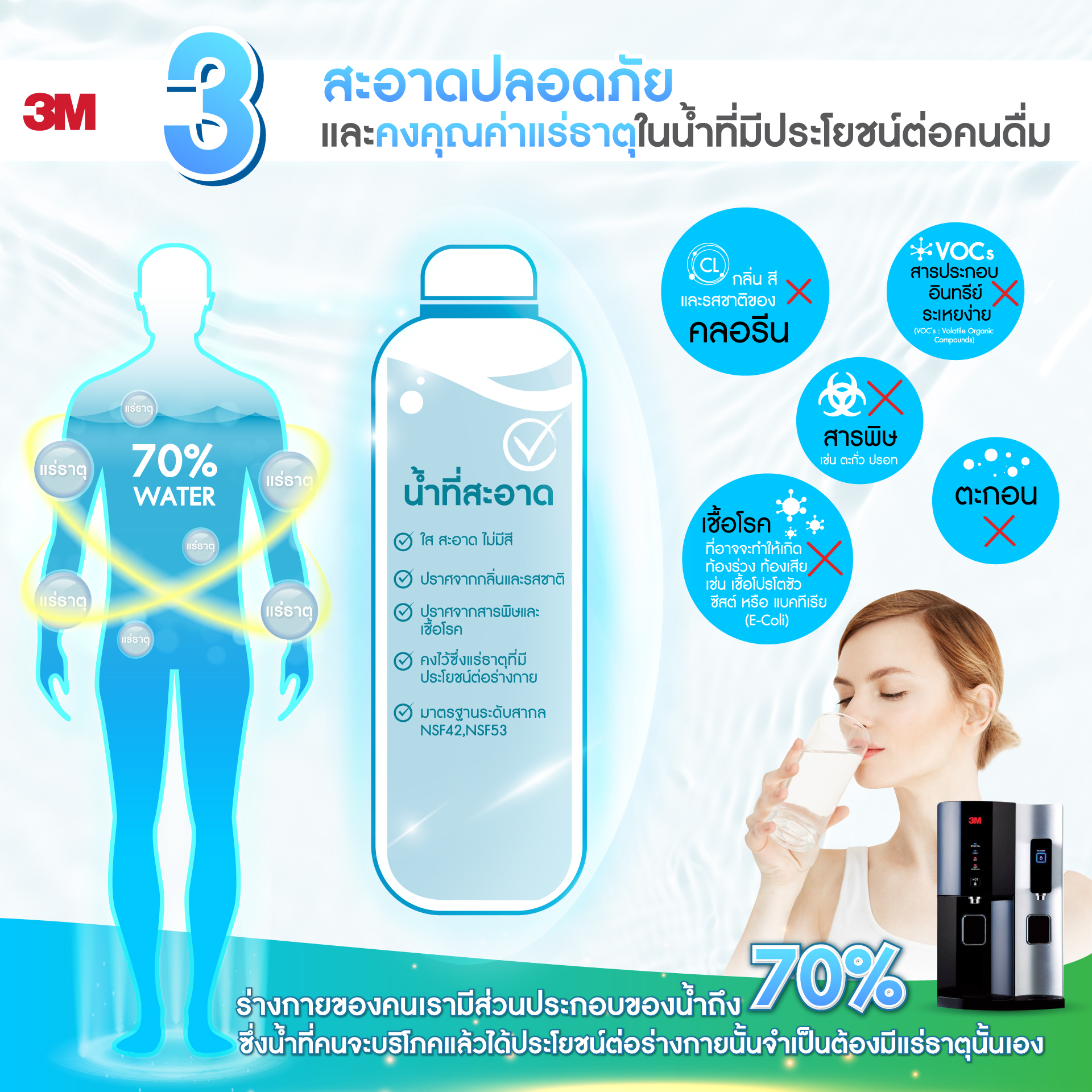 น้ำเป็นปัจจัยหลักในการดำรงชีวิตของมนุษย์ทุกคน เพราะร่างกายการของเรามีส่วนประกอบของน้ำถึง 70% ซึ่งน้ำที่คนจะบริโภคแล้วได้ประโยชน์ต่อร่างกายนั้นจำเป็นต้องมีแร่ธาตุ ซึ่งระบบการกรองของ 3M เครื่องกรองน้ำ จะกรองเฉพาะ ตะกอน สิ่งสกปรก คลอรีน เชื้อโรคและสารพิษ ที่เป็นอันตรายต่อร่างกาย แต่คงไว้ซึ่งแร่ธาตุจำเป็นที่ร่างกายต้องการ ได้แก่ แคลเซีย แมกนีเซียมโซเดียม โพแทสเซียม และ กำมะถัน เป็นต้น คุณจึงมั่นใจได้ว่าจะได้รับประโยชน์จากแร่ธาตุอย่างแน่นอน