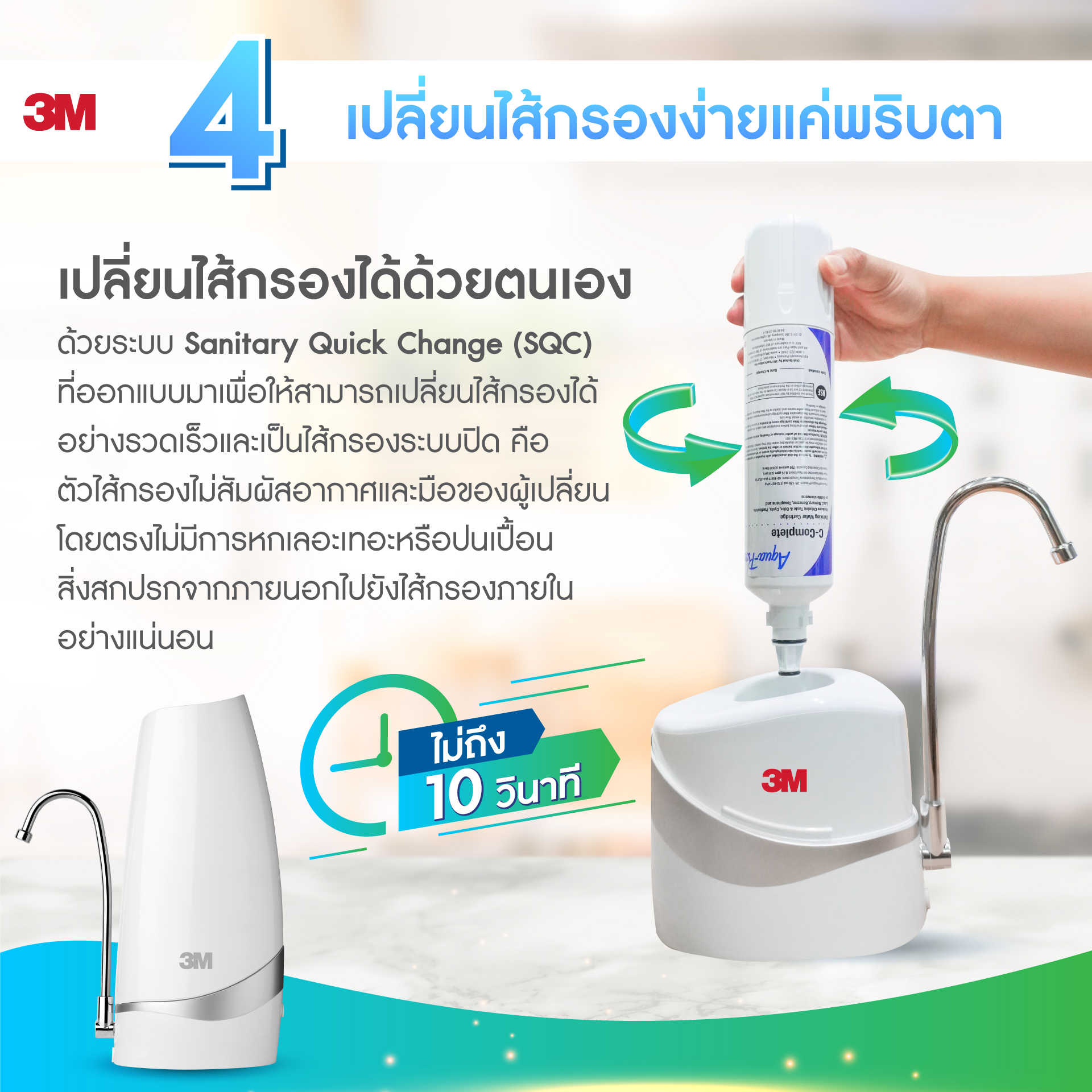 3M เครื่องกรองน้ำมีความใส่ใจผู้ใช้งาน ให้ง่ายต่อการเปลี่ยนไส้กรองน้ำได้ด้วยตนเอง ด้วยระบบ Sanitary Quick Change (SQC) ที่ออกแบบมาเพื่อให้สามารถเปลี่ยนไส้กรองได้อย่างรวดเร็ว และเป็นไส้กรองน้ำระบบปิด คือตัวไส้กรองไม่สัมผัสอากาศและมือของผู้เปลี่ยนโดยตรงไม่มีการหกเลอะเทอะหรือปนเปื้อนสิ่งสกปรกจากภายนอกไปยังไส้กรองภายอย่างแน่นอน