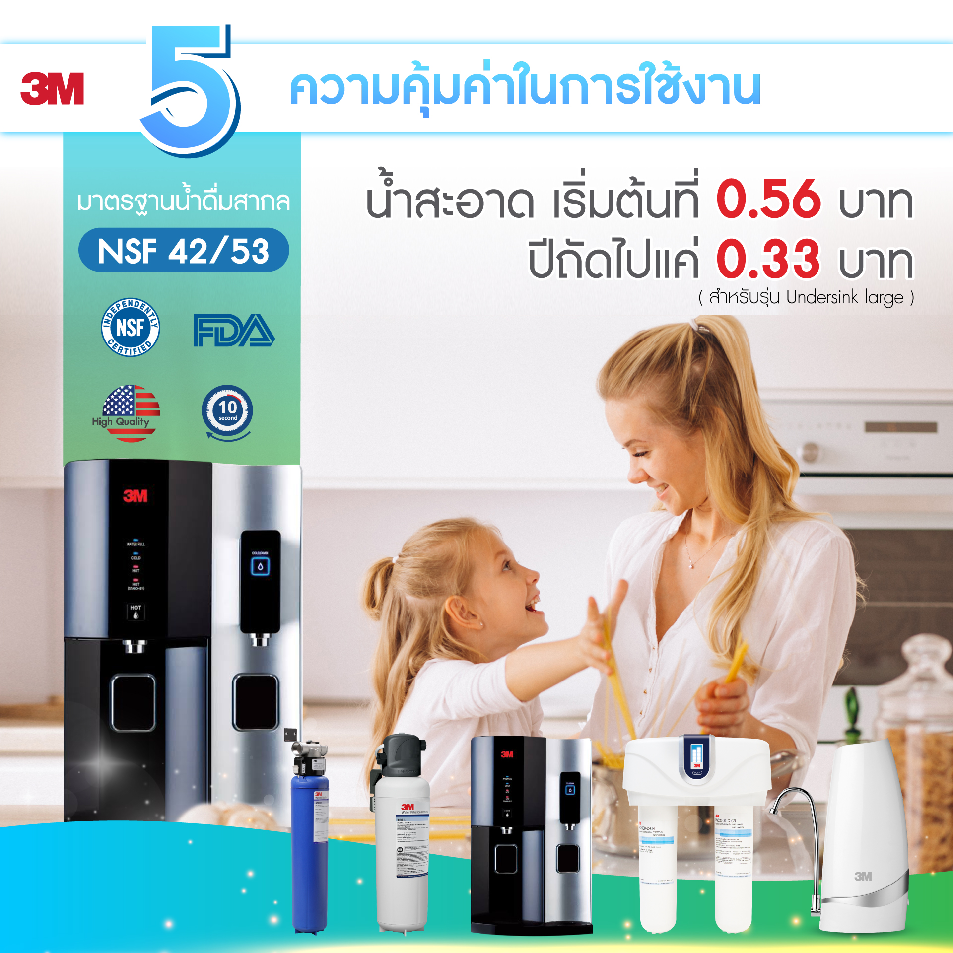 นอกจาก 3M เครื่องกรองน้ำจะได้รับการรับรองมาตรฐานสากลทั้งด้านกายภาพและด้านสุขภาพ NSF / ANSI 42, NSF / ANSI 53 และวัสดุที่ใช้ผลิตผ่านมาตรฐานสำนักงานคณะกรรมการอาหารและยาของสหรัฐอเมริกา (FDA) ที่การันตีด้านคุณภาพแล้ว ยังมีอีกสิ่งหนึ่งที่คุณควรรู้ นั้นคือความคุ้มค่าในการใช้งาน 3M เครื่องกรองน้ำ เพราะเมื่อคุณเห็นราคาของสินค้าแล้ว เมื่อนำมาหารเฉลี่ยการใช้งานน้ำต่อปีจะเริ่มต้นเพียง 0.56 บาท และในปีถัดไปจะตกอยู่แค่ 0.33 บาท เท่านั้นเอง นี่เป็นสิ่งหนึ่งที่พิสูจน์ได้ว่า 3M เครื่องกรองน้ำ ยิ่งใช้งาน ยิ่งคุ้มค่า